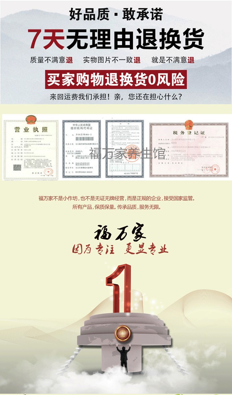 您的擔心是很必要的!要知道,網上買都存在風險,但我們文山福萬家是對客戶長期維護的,服務是有口皆碑的,雖然我們暫時不是什么大公司,但是我們將一直發展下去,因為這既是我們的生存之道,也是對老客戶的責任。關于產品,發貨都是從我們文山本地發的,三七都保證是不帶剪口不打蠟的足干本色水洗春七,重點是不帶剪口,一般您在市場上是買不到這么好的三七的。包裝上都有我們福萬家的品牌標識地址電話,不是市面上的那種三無產品。除了品牌品質保證,還給您承諾30天無理由退款退換貨保證。